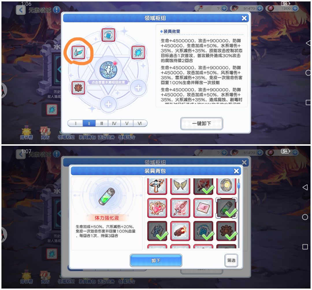 不同的关卡对应着不同的伤害,举个🌰:水系领域造成水伤,火系领域造成火伤,以此类推,每个领域下面小字可以知道其抗啥,弱啥,根据不同关卡可以设置不同的负伤枢纽。