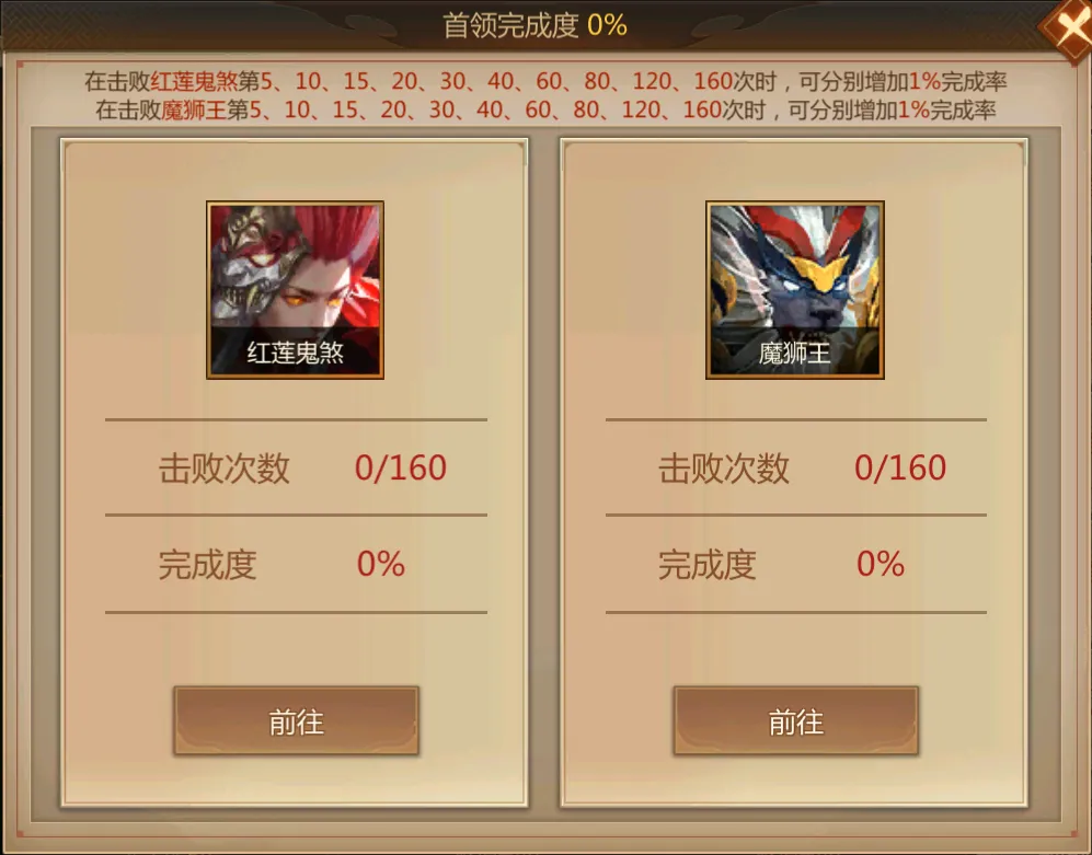 挑战两位首领达到累计次数也可积累完成度,该部分合计最高可获得20%完成度。