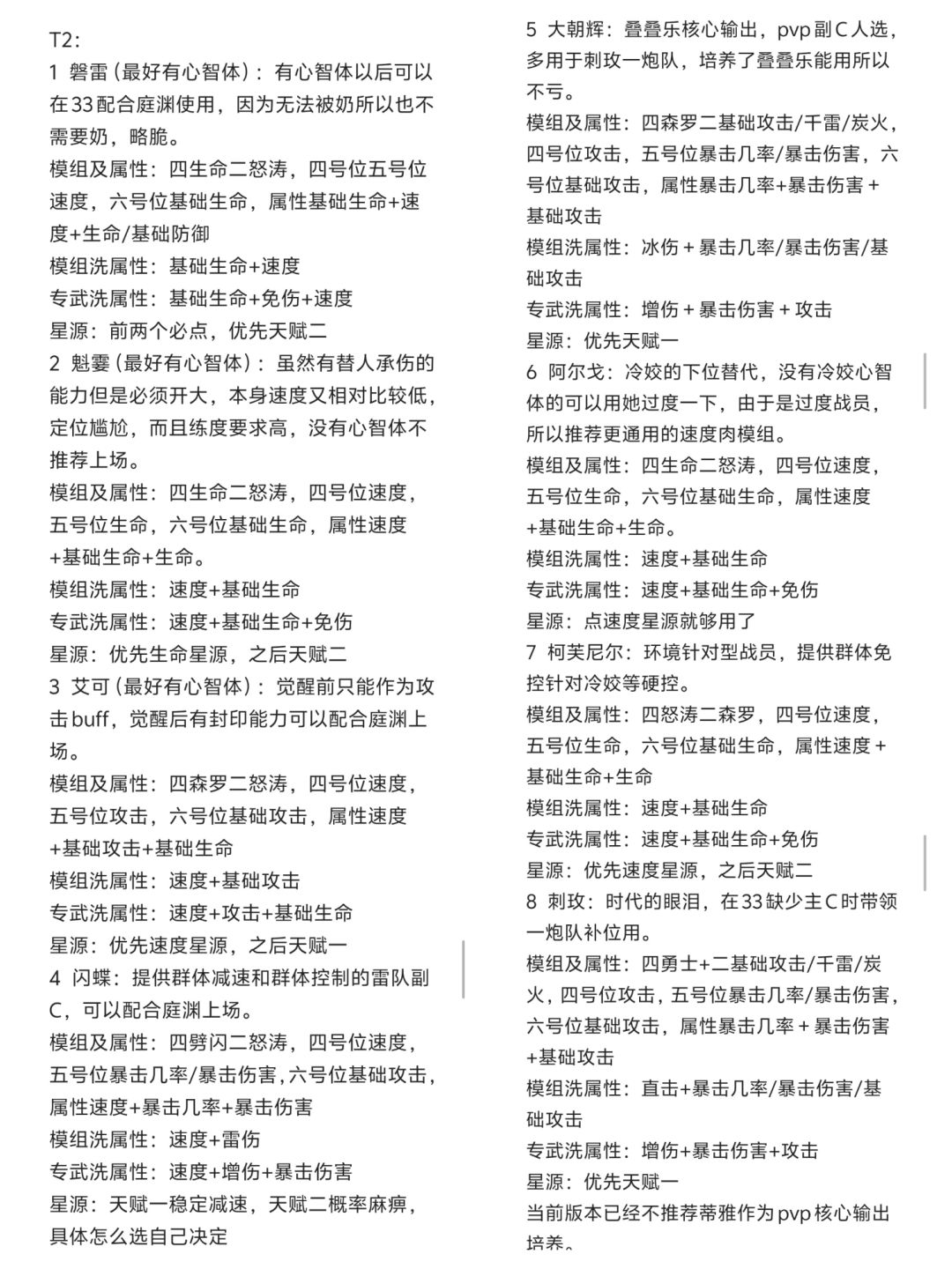 T0:在pvp中有不可替代的作用,11和33核心战员,且在一段时间内不会被淘汰,可以放心培养。