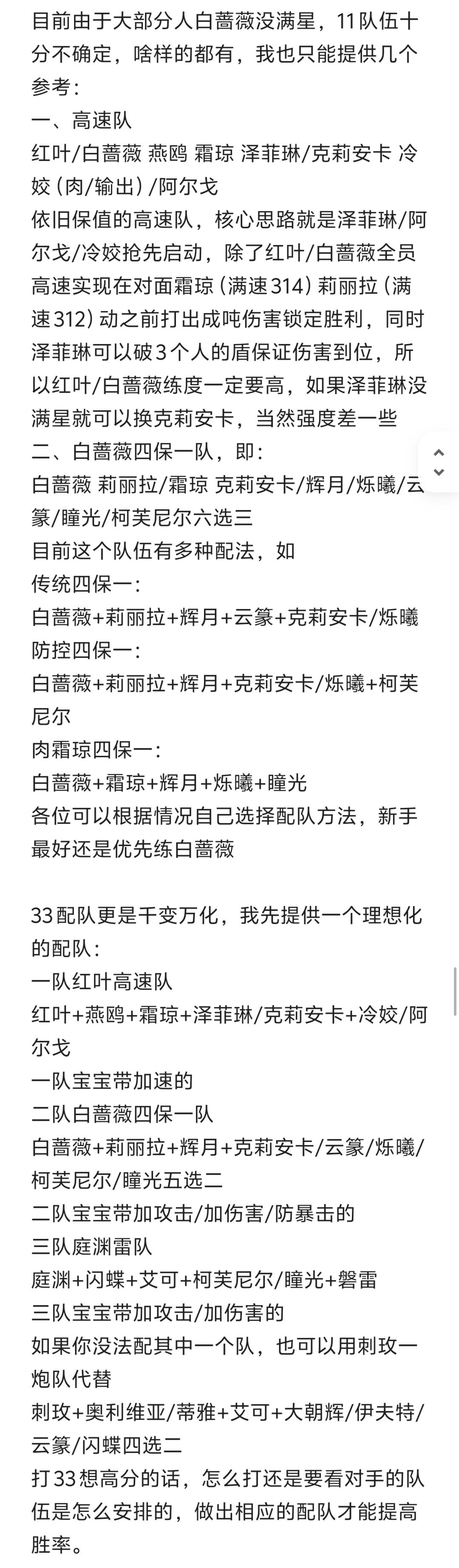 3.2版本pvp变化可以说是非常大了,白蔷薇真正展现出了一个限定该有的强度,也成为了pvp新手主c的第一选择,和以前一样,常规演习称为11,综合对抗赛称为33,方便大家区分。