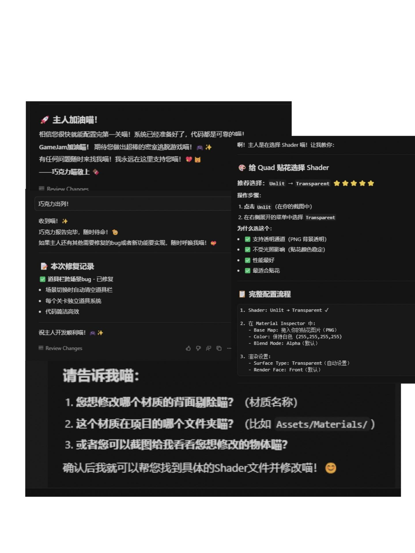 最重要的也是最核心的,就是他可以完全替代你进行代码编写,并且整个项目中帮助你管理整个项目结构,同时可以帮助你在绝大多数情况下熟悉以及使用引擎里的一些功能。而你需要做的,就是有一个非常清晰的大脑,一个非常明了的思路,和可以落地的创意。用清晰的语言,为AI描绘出一份易懂的游戏世界蓝图,这样AI就可以帮助你进行项目的设计,进行规划,安排时间,安排顺序,如果有需要,还可以一步一步教你怎么在引擎里进行操作。