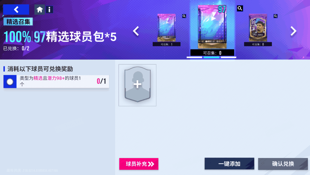 【97精选随机包】阵容召集挑战将于11月11日11时至11月14日11时开启。活动期间每日可进行2次召集挑战,按条件使用1个98精选球员进行召集,可拆分获得5个【97精选随机包】。
