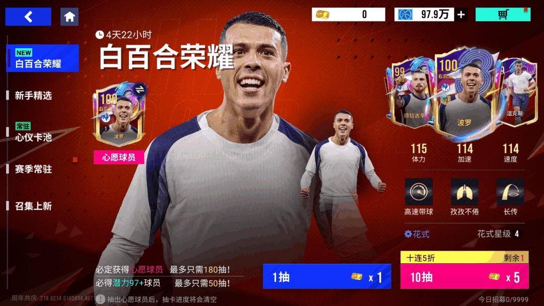 【白百合荣耀】卡池将于11月10日11时至11月17日11时开启!10连可享8折,每日首次10连更能低至5折! 心愿招募券与白百合荣耀招募券(限时)均可参与折扣!每次招募都有概率获得100潜力巅峰波罗,99潜力巅峰德拉古辛、99潜力精选温克斯等球员!