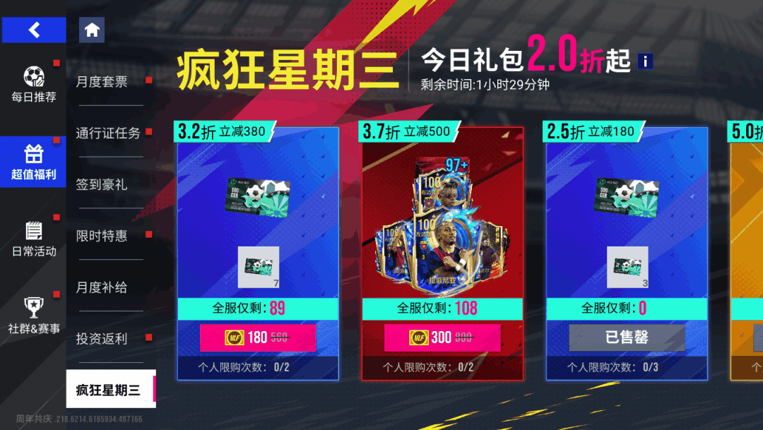【疯狂星期三】仅在周三12-14时、18-20时与21-23时开启,全服玩家都可参与,活动期间可用超低价购买超值商品,每件商品均有限购数量,售完即止。