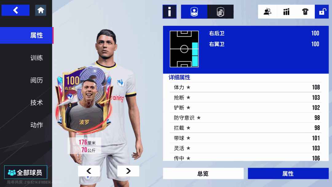 100 潜力值的波罗在右后卫、右翼卫位置将 “往返奔袭 + 攻防全优” 的特质拉满!金色【孜孜不倦】技术让他体力消耗显著更慢,108 体力支撑全场不知疲倦地奔跑;金色【高速带球】技术加持下,107 速度、107 加速的冲刺能力让他推进如闪电,101 带球的盘带技巧更让他在边路突破极具威胁;金色【长传】技术与106 传中数值的结合,使他送出的长传与传中精准度拉满,是球队右路的 “进攻发起点”。103 抢断、102 铲断搭配【协防】【跟防】【强壮】技术,防守端硬度拉满,对手右路进攻常被他强硬断球瞬间瓦解。从防守断球到边路奔袭传中,他堪称 “右路位置的全能引擎”,仅凭一己之力就能盘活球队右路的 “攻防走廊”!