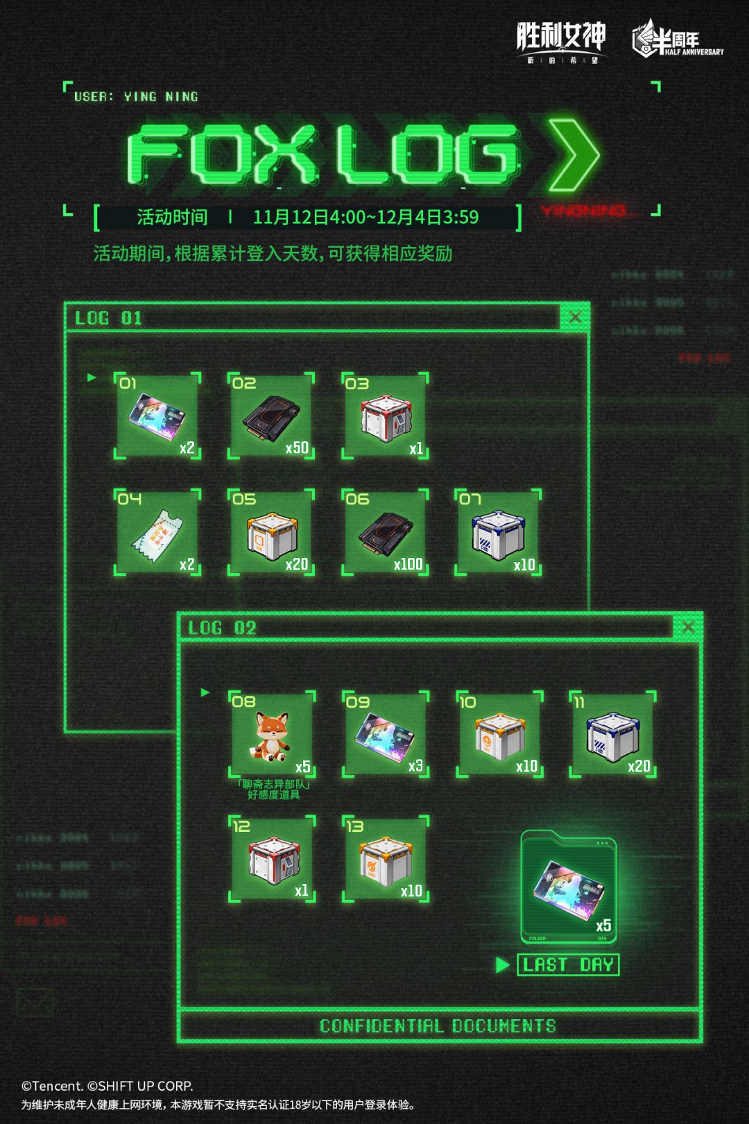 活动期间内,每日登录即可获得奖励,累计登录14天即可获得包括高级招募券*10、养成资源在内的全部奖励!