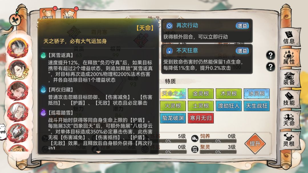 一更快的速度,虽然剑修有仙界1重天命乘风,并且速度成长相对更高,但【霜月寒】天命中也有12%速度提升,如果能在对方出手前开动还是有机会秒掉前排的。