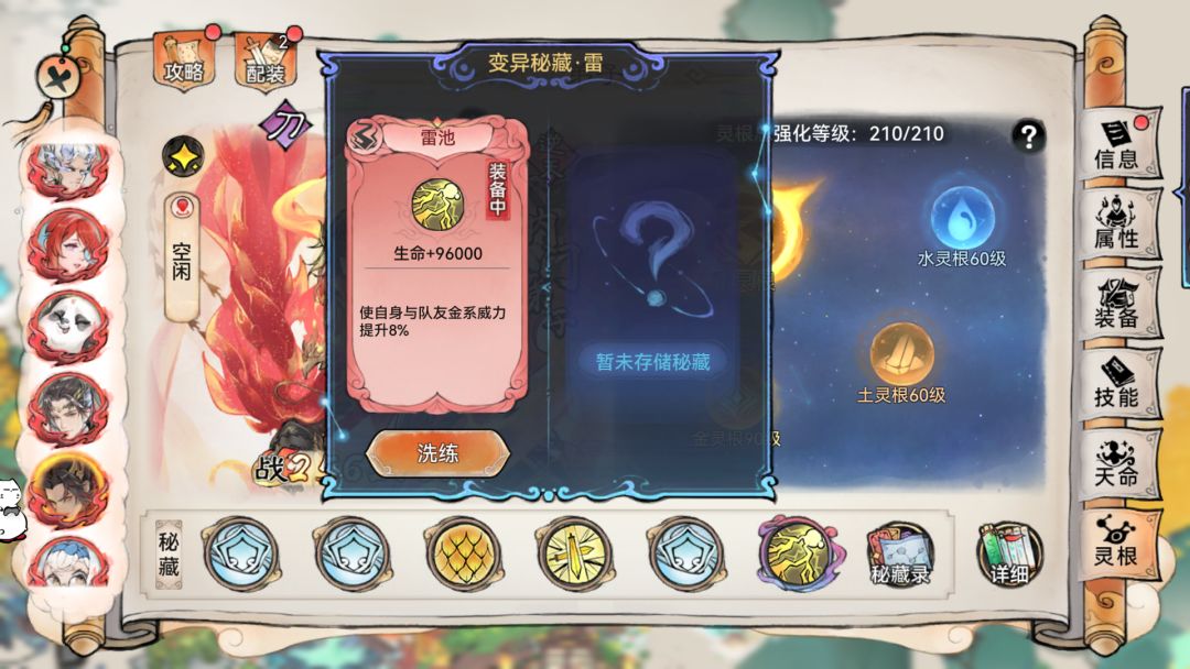 如果更偏向PVE,可以选择金灵根,虽然打仙虚并不能够暴击,但是可以变异出来【雷池】密藏,提高队伍【天一】技能的伤害。不过【雷池】效果并不能叠加,如果已经有【卫寒】变异了,更推荐【霜月寒】变异水灵根。