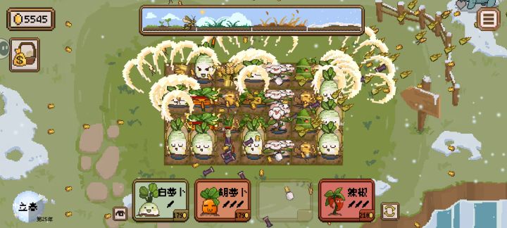 前期找人参,竹子和竹笋,开荒两排后开始找棉花,稳定开荒所有。然后开始为无尽做准备,留一个竹子,然后找花生,花生不需要多,只为了那个特效消耗,然后做红白箩卜,中期没事可以留个小麦,卖卖东西刷伤害,后面就可以挂机了