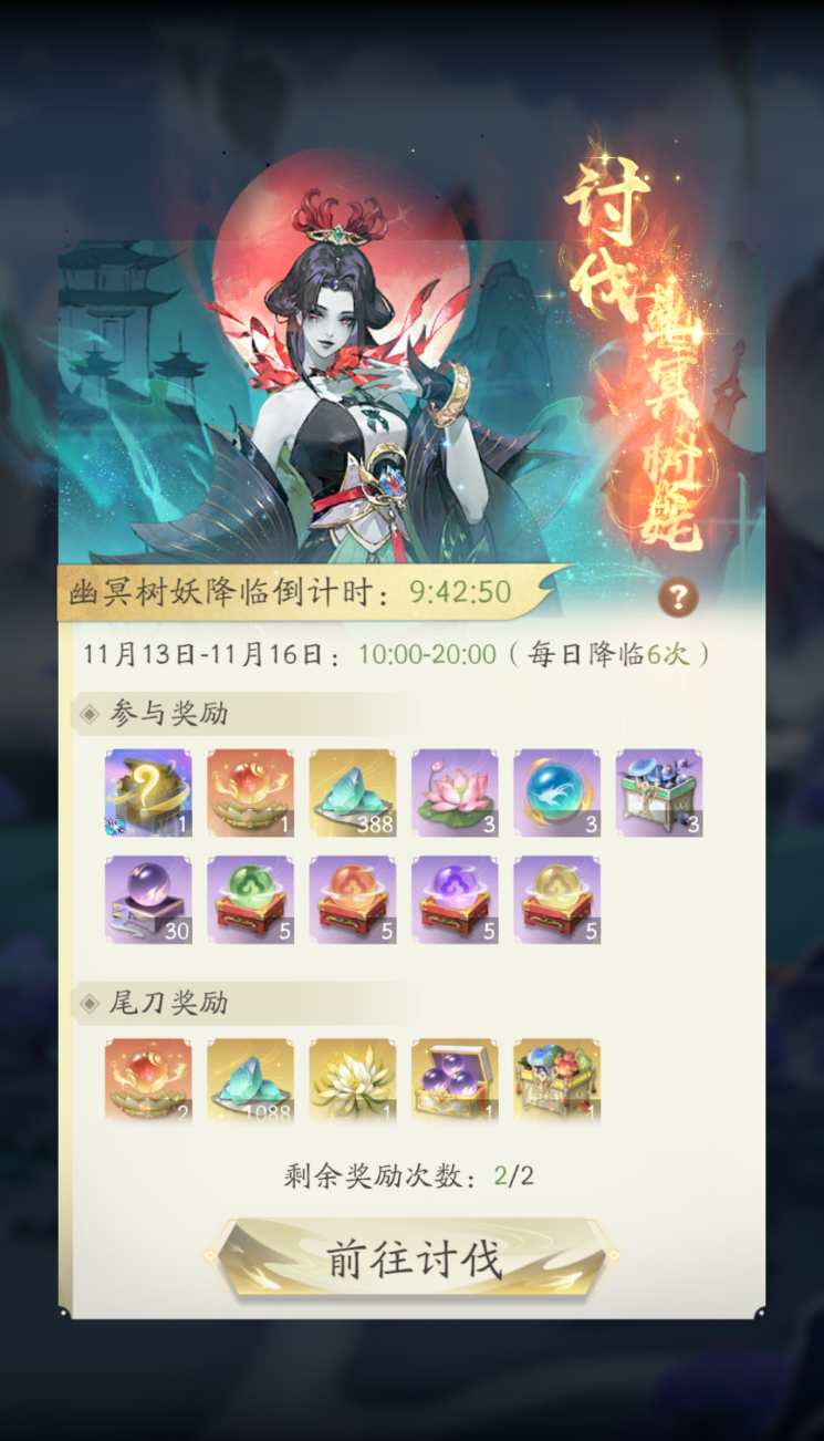 活动玩法:参与讨伐可获得幽冥树妖秘宝以及灵石等珍贵道具~