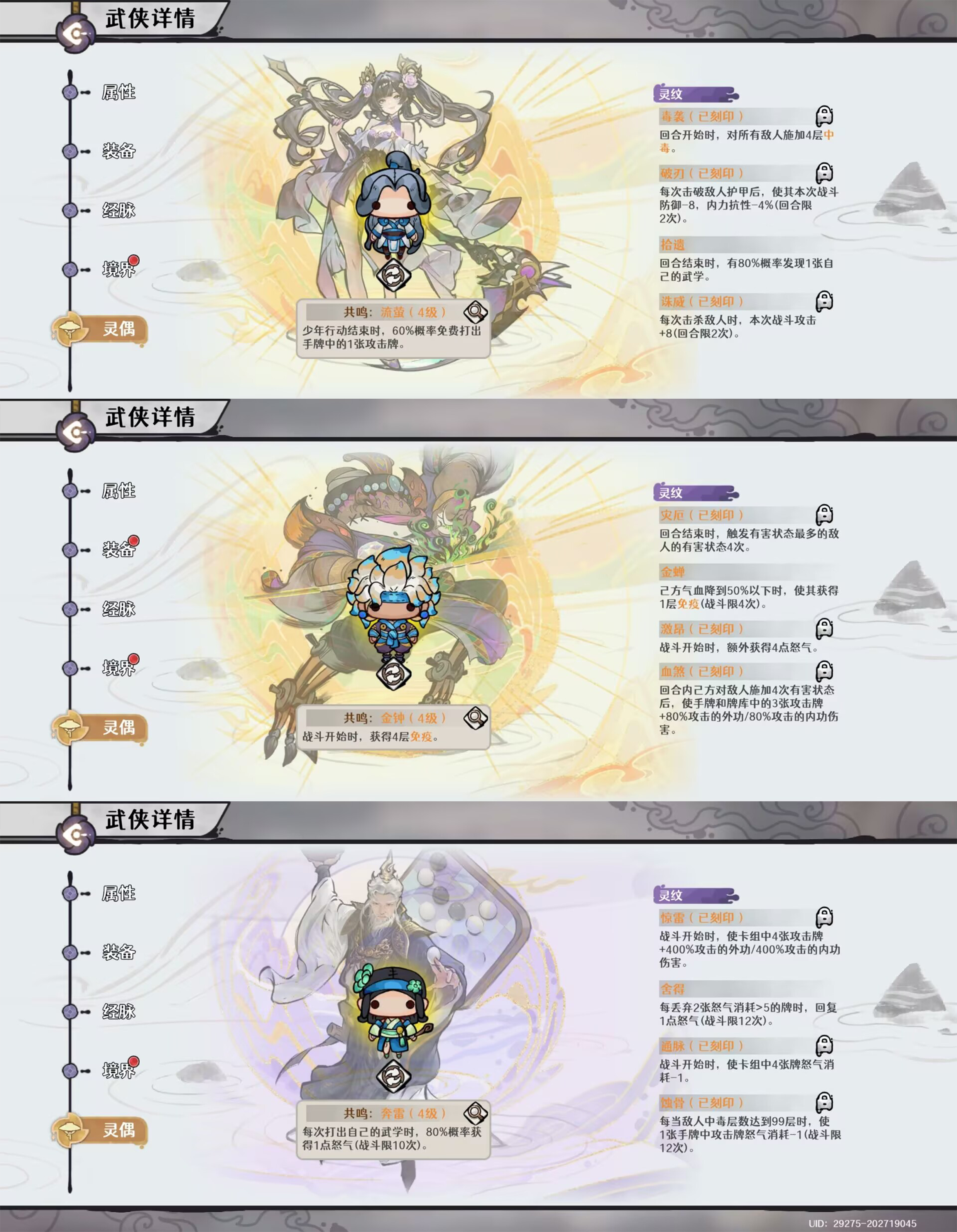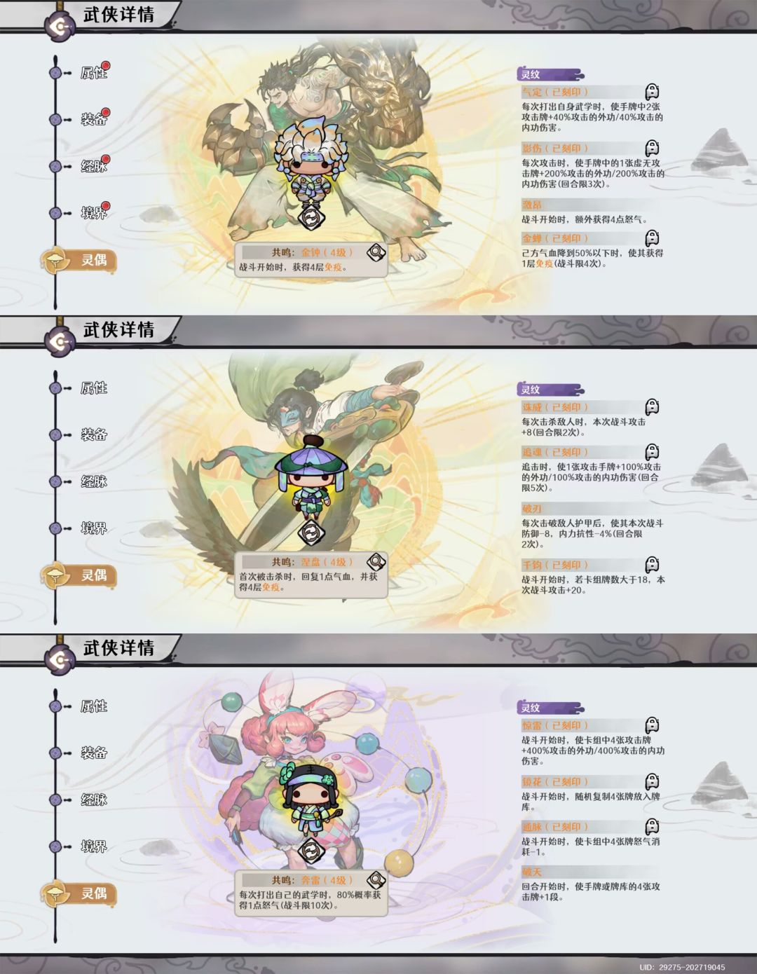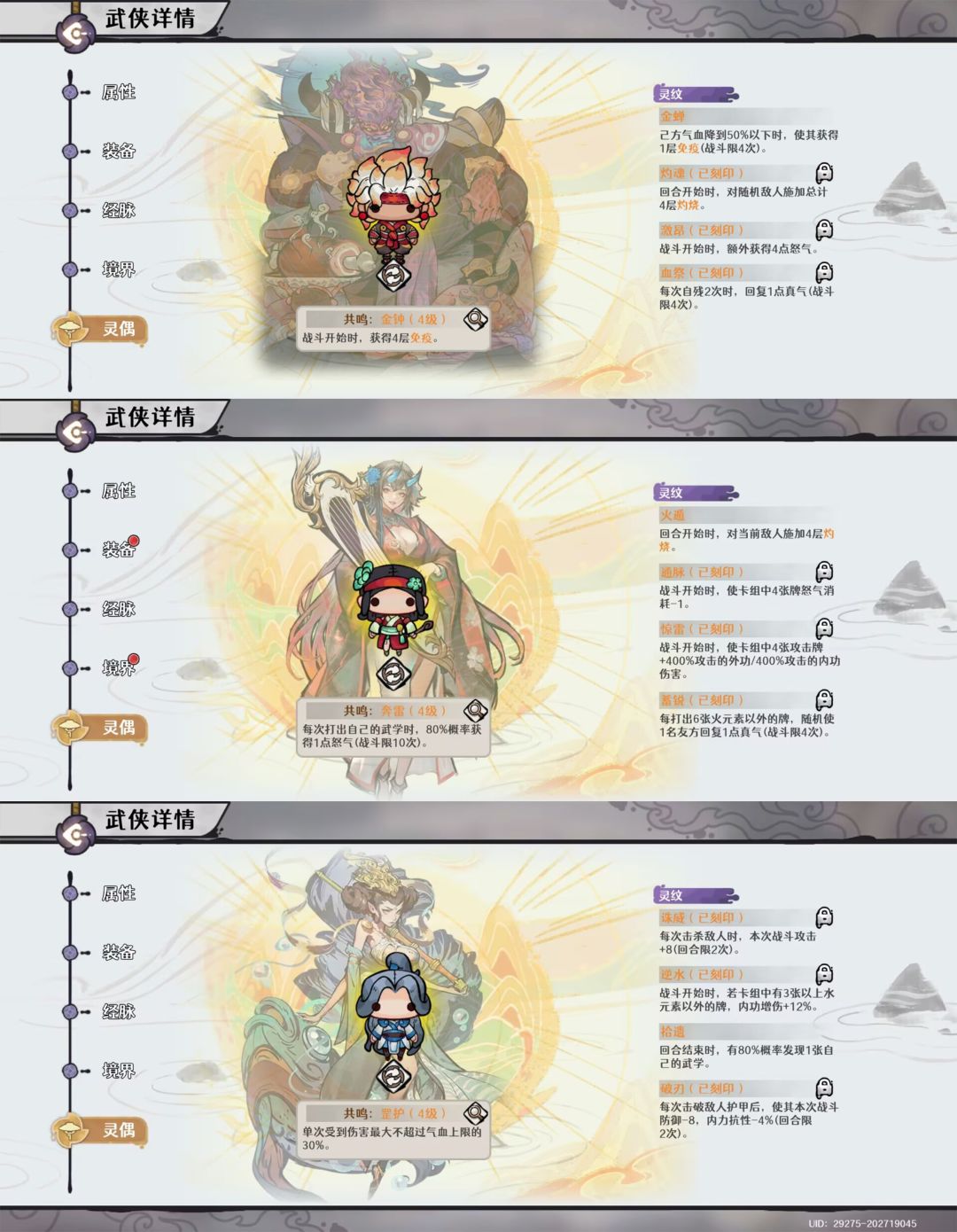 豪侠的【共鸣】选择:【金钟】,和【灵纹】选择【金蝉】与【激昂】。个人理解是必备的顶级保命和辅助的选择。