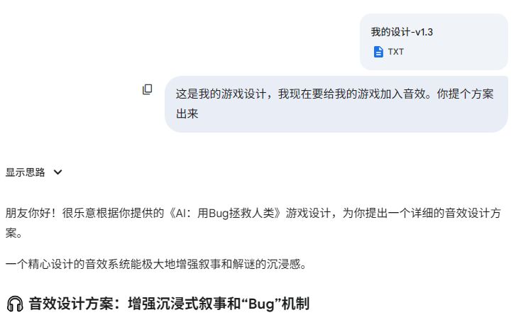 和美术开发类似,首先还是把游戏方案给AI,让它分析哪里需要加入音效,以及具体要怎样的音效。