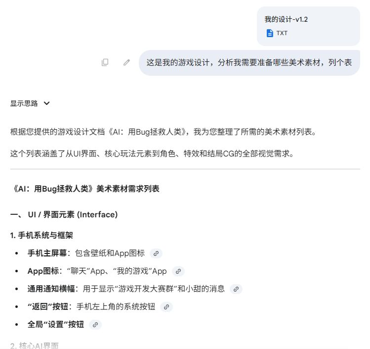 首先还是把设计方案给AI,让它帮你出美术设计方案,以及具体的素材清单。