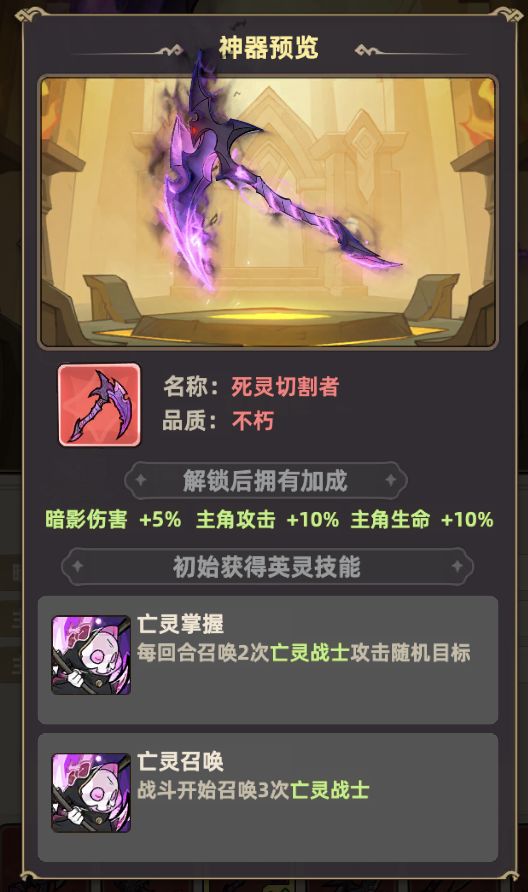提供5%暗影伤害加成,同时获得初始可选亡灵英灵技能,开局就有忠诚的亡灵战士上阵厮杀。