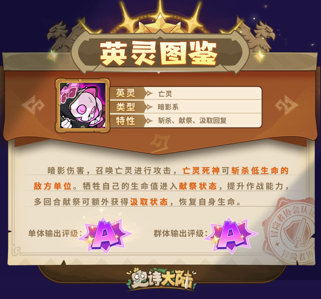 亡灵英灵拥有较为平衡的单体与群体输出,有着低生命斩杀收割、献祭汲取等多种作战方式,在战场上表现十分亮眼。