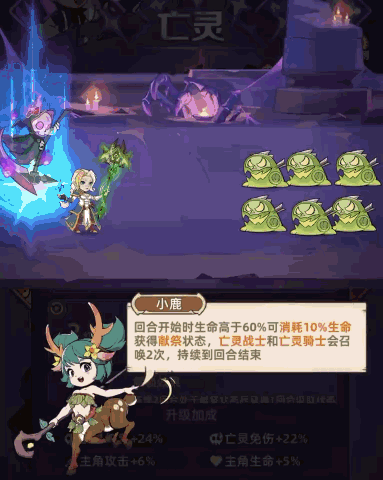回合开始时生命高于60%可消耗10%生命获得献祭状态,亡灵战士和亡灵骑士会召唤2次,持续到回合结束。