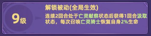 英灵等级升至9级,局内解锁【汲取状态】选项。连续2回合处于亡灵献祭状态后获得1回合汲取状态,每次召唤亡灵骑士回复自身2%生命。