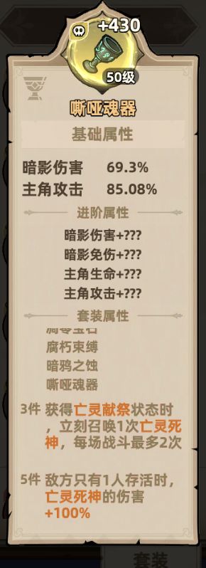 亡灵英灵的核心圣遗物套装,集齐3件套与5件套时,可解锁【获得亡灵献祭状态时,立刻召唤1次亡灵死神,每场战斗最多2次】和【敌方只有1人存活时,亡灵死神的伤害+100%】的技能效果。
