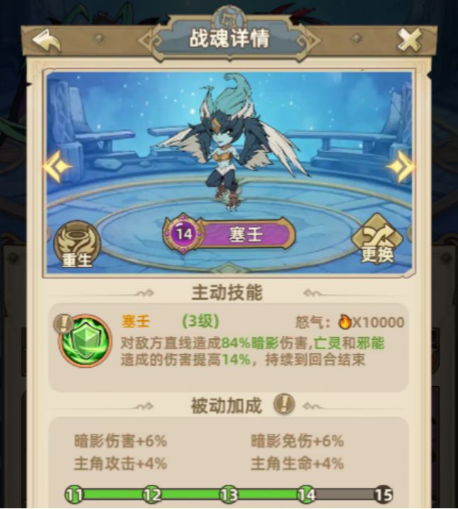 英灵等级升至18级,局内解锁【亡灵死神】选项,召唤5次亡灵骑士后召唤1次亡灵死神攻击全体敌人,极大提升亡灵群体输出能力。
