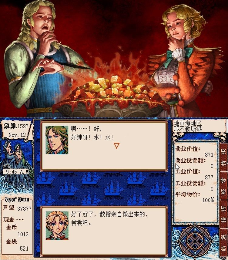 外传女主剧本里,朱利亚诺教授委托女主去东南亚买香料作咖喱。但由于教授第一次做咖喱没经验,放多了新大陆的辣椒,把这俩辣个半死。新增的插画很好展示了这个黑暗料理。