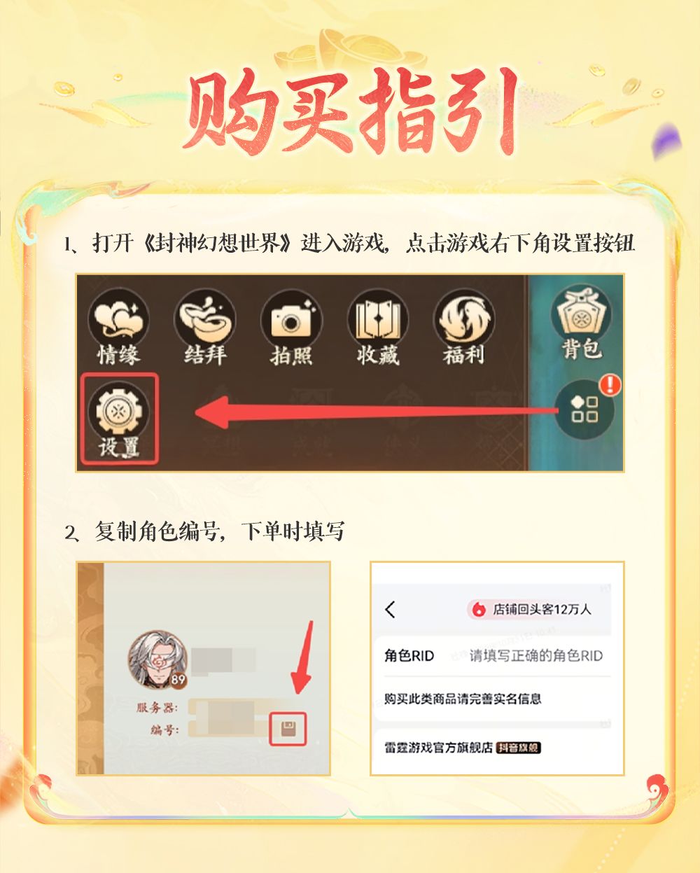 1、下单礼包时须填写角色信息,商品将在购买成功后即刻直接发放至下单时填写的游戏角色中,登录角色即可领取,届时会通过邮件提醒告知购买内容。请大人们注意核查角色信息!