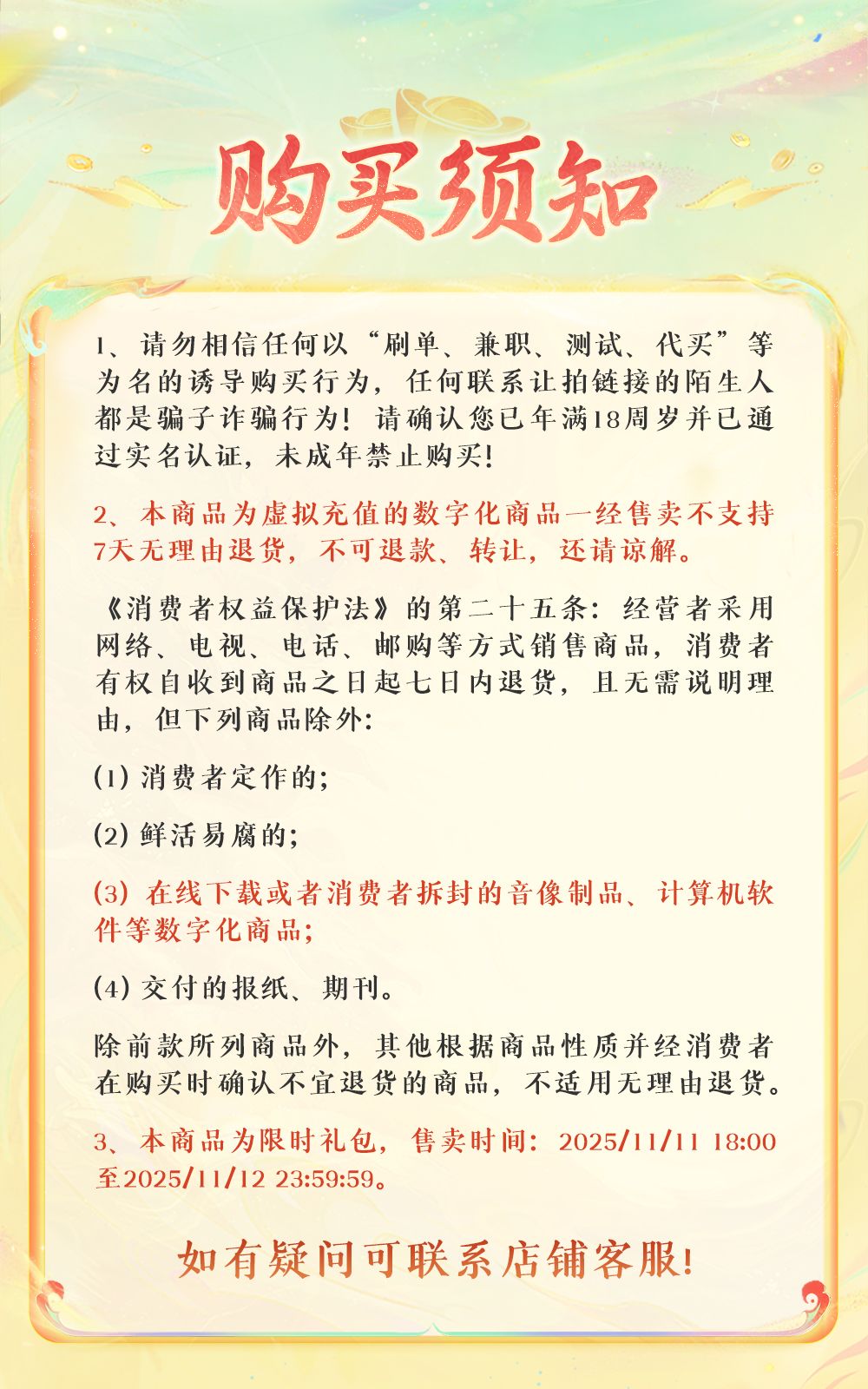 2、礼包为虚拟商品,不支持退货、退款、转让,请大人阅读以下购买须知,谨慎购买。