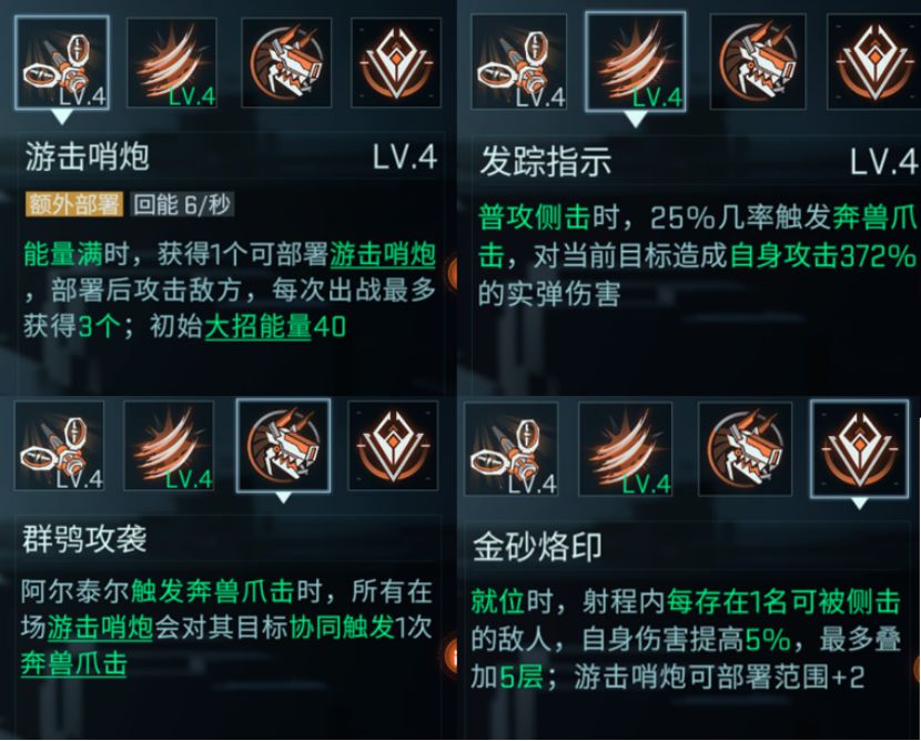 大招【游击哨炮】最多获得3个额外部署的游击哨炮,初始大招能量40。战技【发踪指示】在普攻侧击时概率触发奔兽爪击,造成实弹伤害。