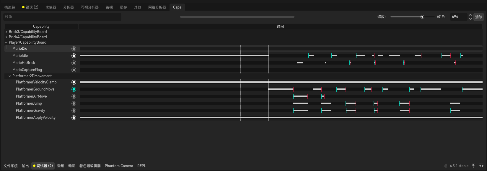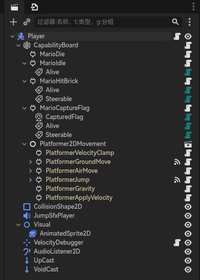 上图是一个简单的使用 Capability System 构建的 2D 马里奥示例,插头图标的是 Capability,例如 MarioDie 和 MarioIdle。CapabilityBoard会每帧深度优先遍历自己的子节点,依次运行它们的处理逻辑,因此可以简单地通过嵌套 Node 和上下换位来调整 Capability 的运行顺序。