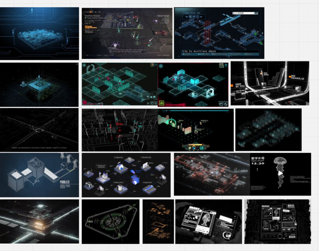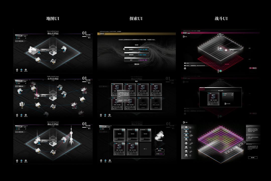 我们通过创建系统的情绪板进行风格探索,最终决定构建一个以暗色调与黑白素色为基底,辅以功能性霓虹光效的视觉世界。其核心理念是表现一个高度理性、却因底层技术陈旧而处处显现破损与噪频的“数据废墟”。
