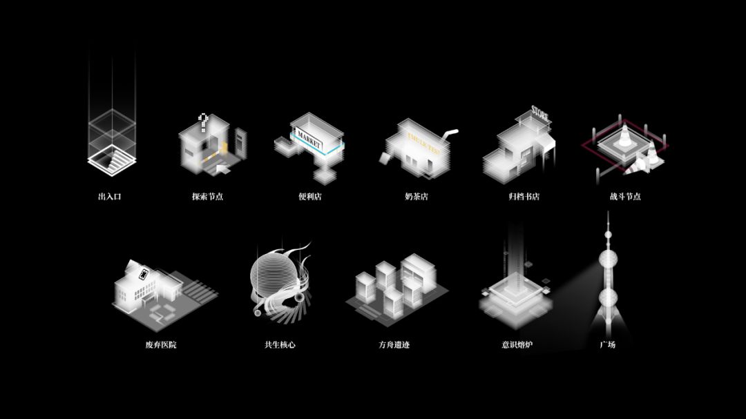 而“废弃医院”、“共生核心”“方舟遗迹”“意识熔炉”则是游戏的不同结局建筑。