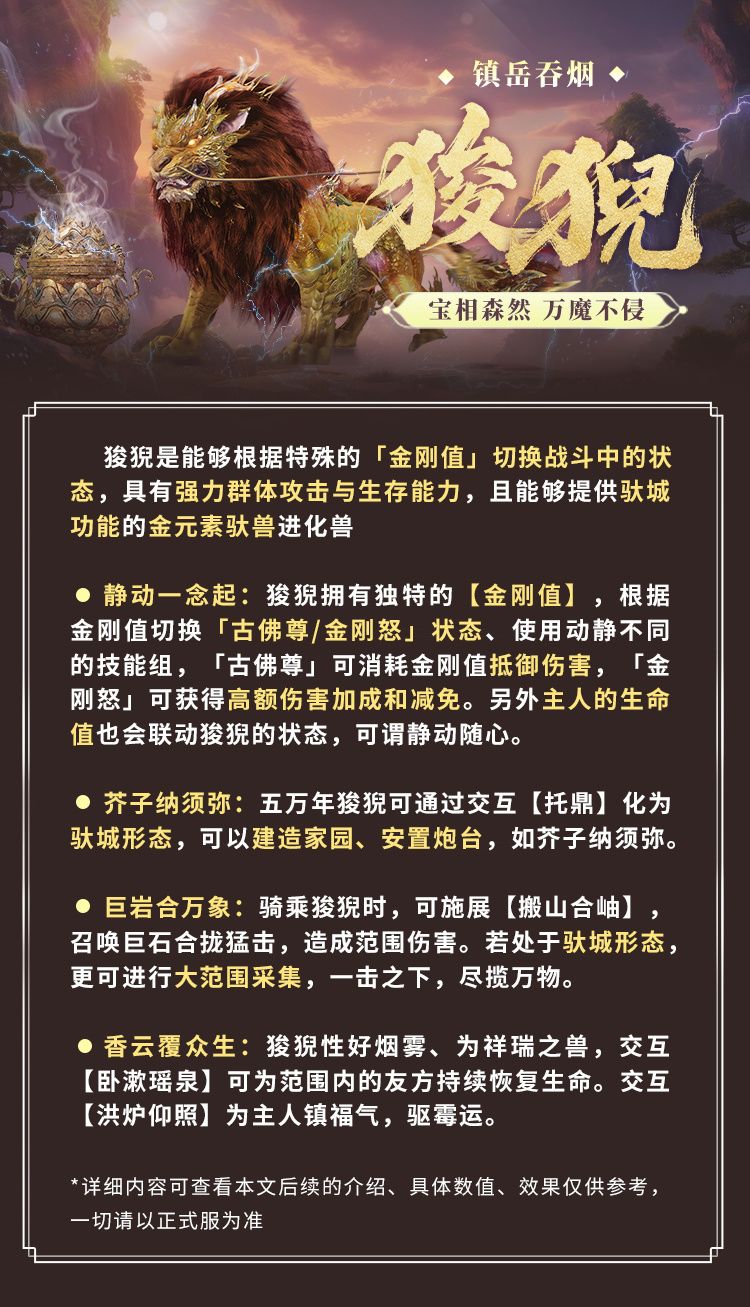 ●芥子纳须弥:五万年狻猊可通过交互【托鼎】化为驮城形态,可以建造家园、安置炮台,如芥子纳须弥。