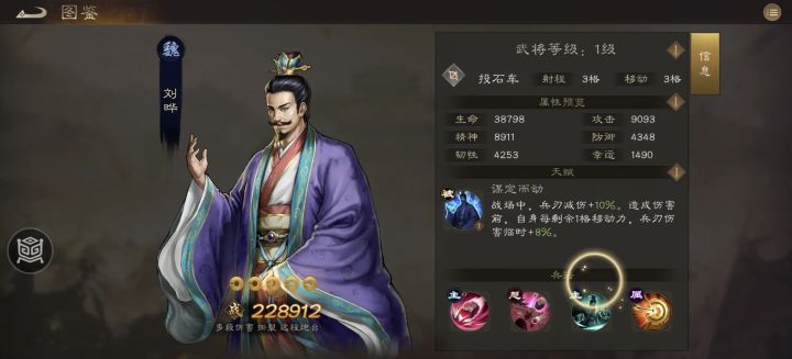 发起攻击前,自身每留存 1 格移动力,就能临时获得 8% 的兵刃伤害提升。这是刘晔伤害拉满的关键所在,操作核心在于攻击前尽量减少移动或保持静止。刘晔的投石车兵种基础移动力为 3 格,若回合内不移动直接攻击,可叠加 3×8%=24% 的高额兵刃伤害加成。该加成会在其他伤害增益的基础上进行乘法计算,实战收益极为可观。简单来说,驾驭刘晔的关键就是 “以静制动”—— 将他部署在安全的高地位置,保持原地不动,才能充分发挥其射程优势与伤害潜力。