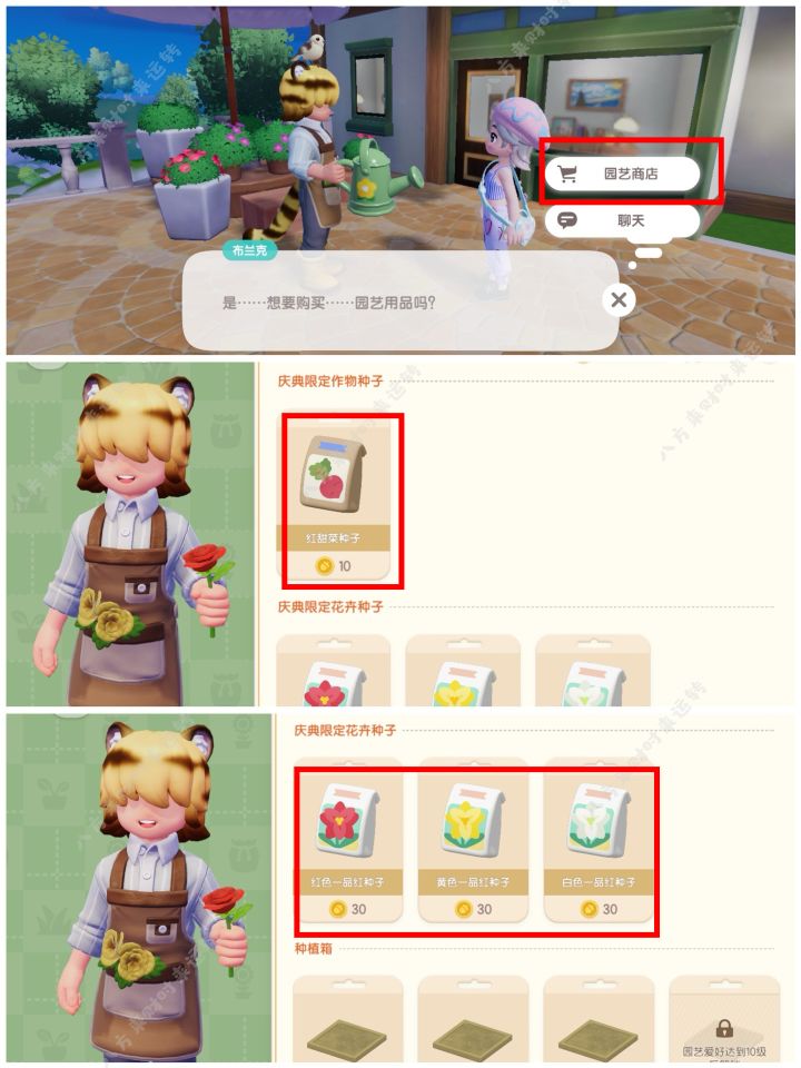 1、去找布兰克购买作物-红甜菜种子、限定花卉-一品红种子;