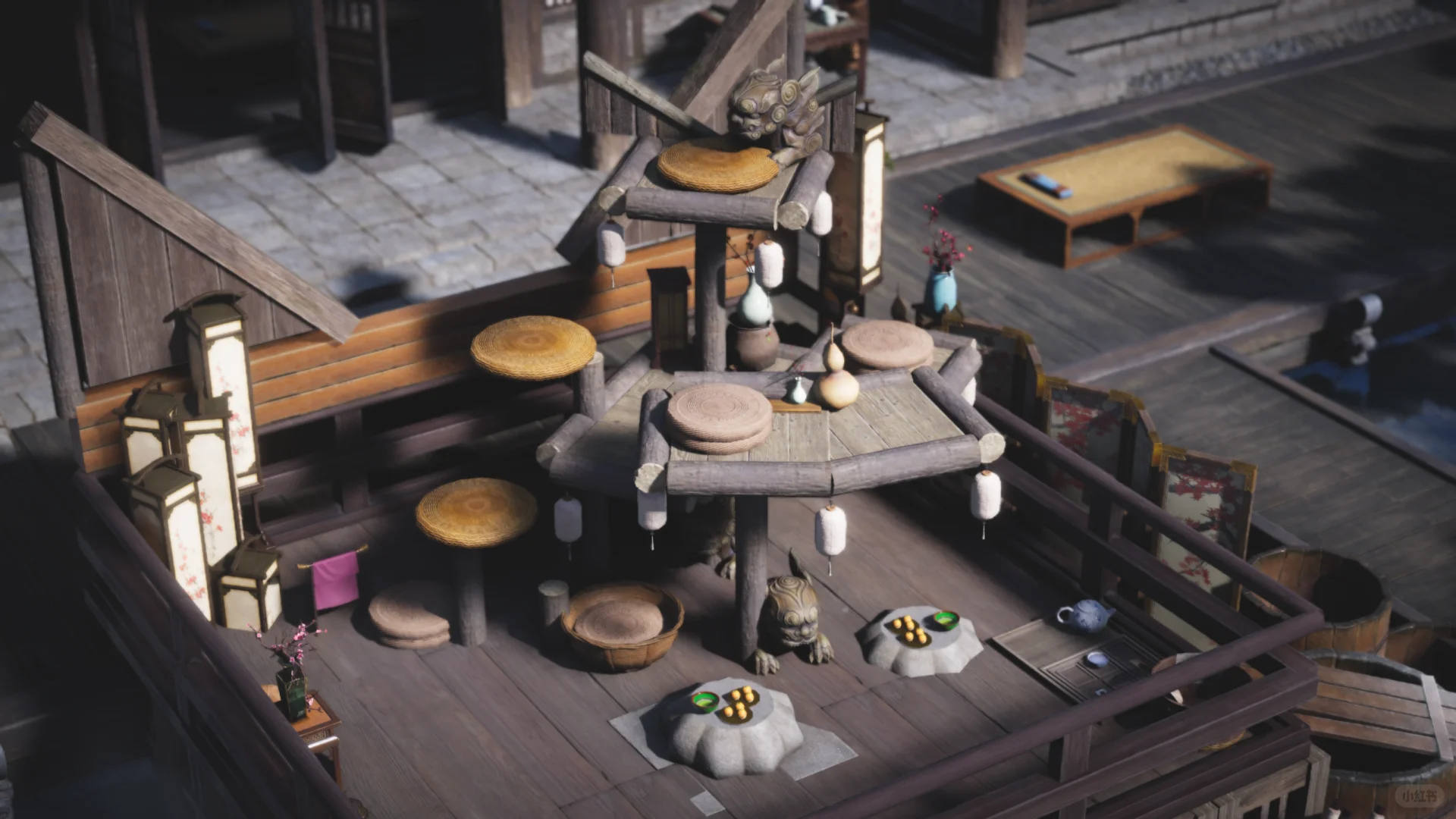 自百业驻地开放建设,江湖各处便涌现出独居匠心的营造盛景。游侠们将理想家园在百业驻地中一一具象实现,或以枫色点染鎏华殿,或建舞台供社员一展歌喉,更有巧思者在驻地的一角建了猫爬架。这片天地在“土木宗大能”的神通下,承载起各家独特的故事。
