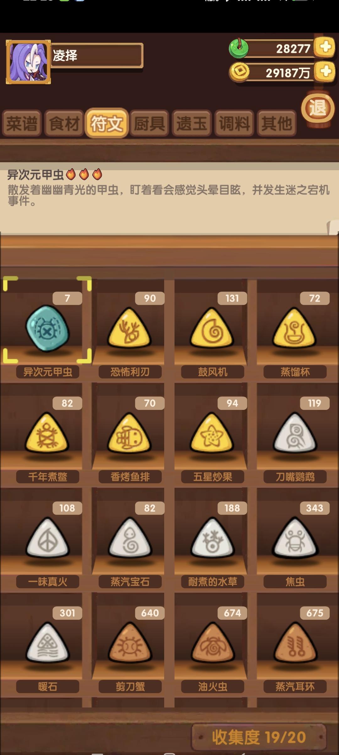 今天继续刷金符文,因为各种原因 尽管只拉了7份 但也做不到到点必上的程度,不过还好今晚也是能让蒸馏杯、香烤鱼排这两种金符文达到70了,如果周年庆角色不多 应该能一口气修炼吧?