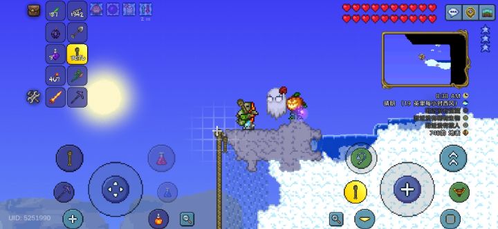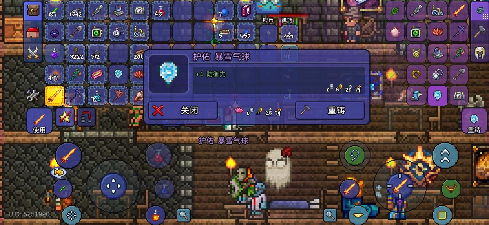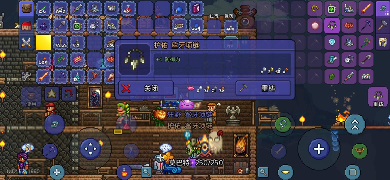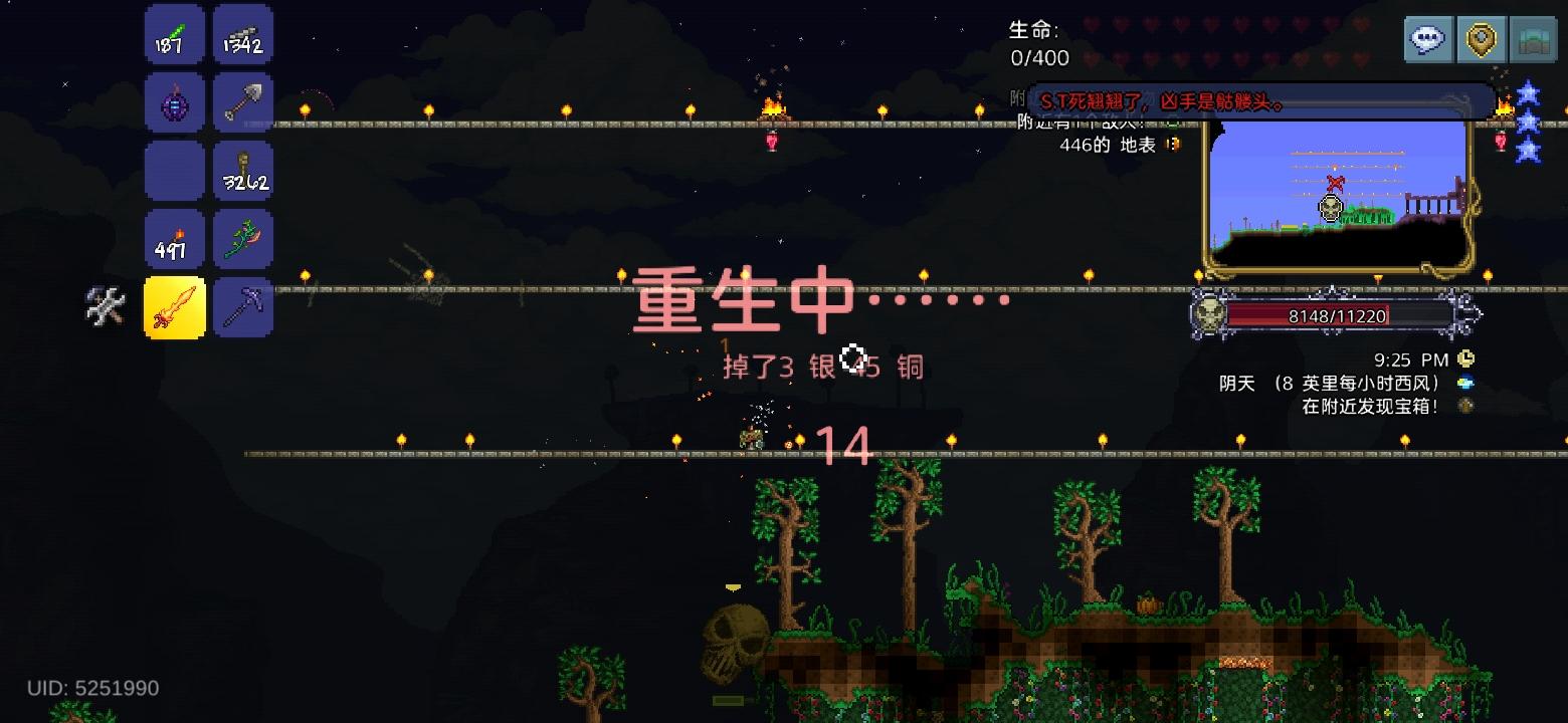 去探索丛林洞穴找到了4瓶重力药水,一次性把地图上的空岛都探索完了,找到了一把星怒和两个红气球,红气球的话拿来和暴雪瓶合成成暴雪气球了,之后重铸了一下结果一发入魂出了护佑(不过其实也是浪费,因为已经能合成白马掌气球束了,给忘记了)之后简单拿了一点点增益品就去挑战骷髅王了,将骷髅王的双手解决后走位失误被骷髅王发射的骷髅头击中并死亡了,也是暂告一段落,因为还有一个家伙没解决,不过在这之前先刷了个血月拿个鲨牙项链,因为有个没用的饰品占着饰品栏,之后刷到了居然也是一发入魂出了护佑,接着拿着肉前的顶尖装备就去腐化之地捉虫了。