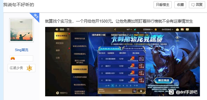 这不,有玩家给官方运营出招,只需花费1500元就能找到一个包干杂活,还能盯着排行的得力干将