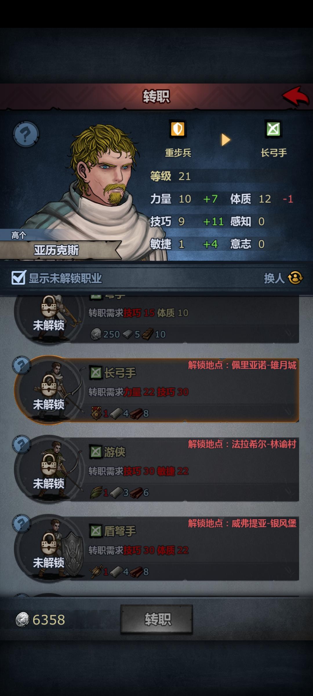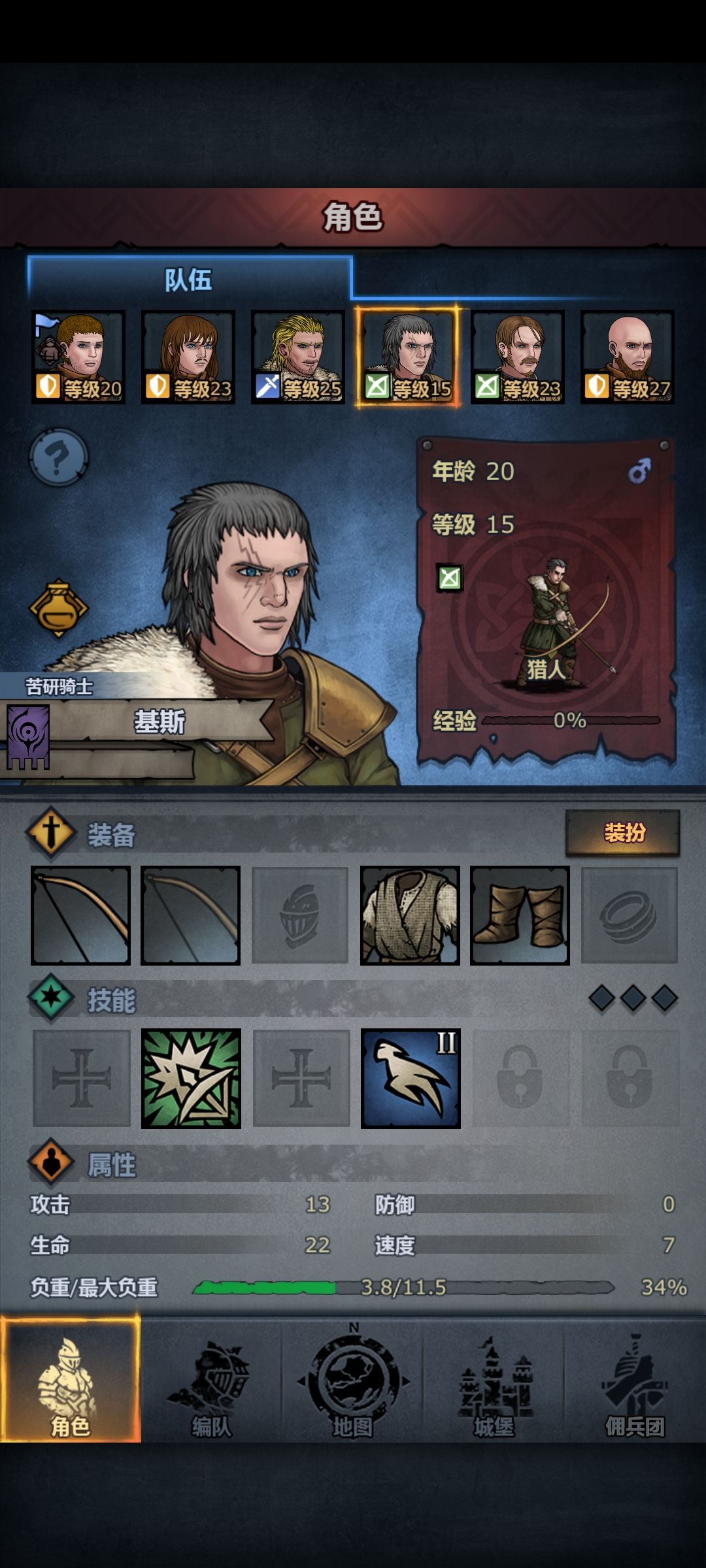 这个阶段要招长弓苗子了,要求c技b力以上,年龄别比基司还大,等级要低。酒馆找不到的话基司够三转了就买一个朗姆酒招萨姆或者6元塞宁佣兵,直接买18的佩尔贵族佣兵也行。第二个长弓不要太早,最早建议下一篇林瑜村之前开始刷任务买。最晚基司练够了买。