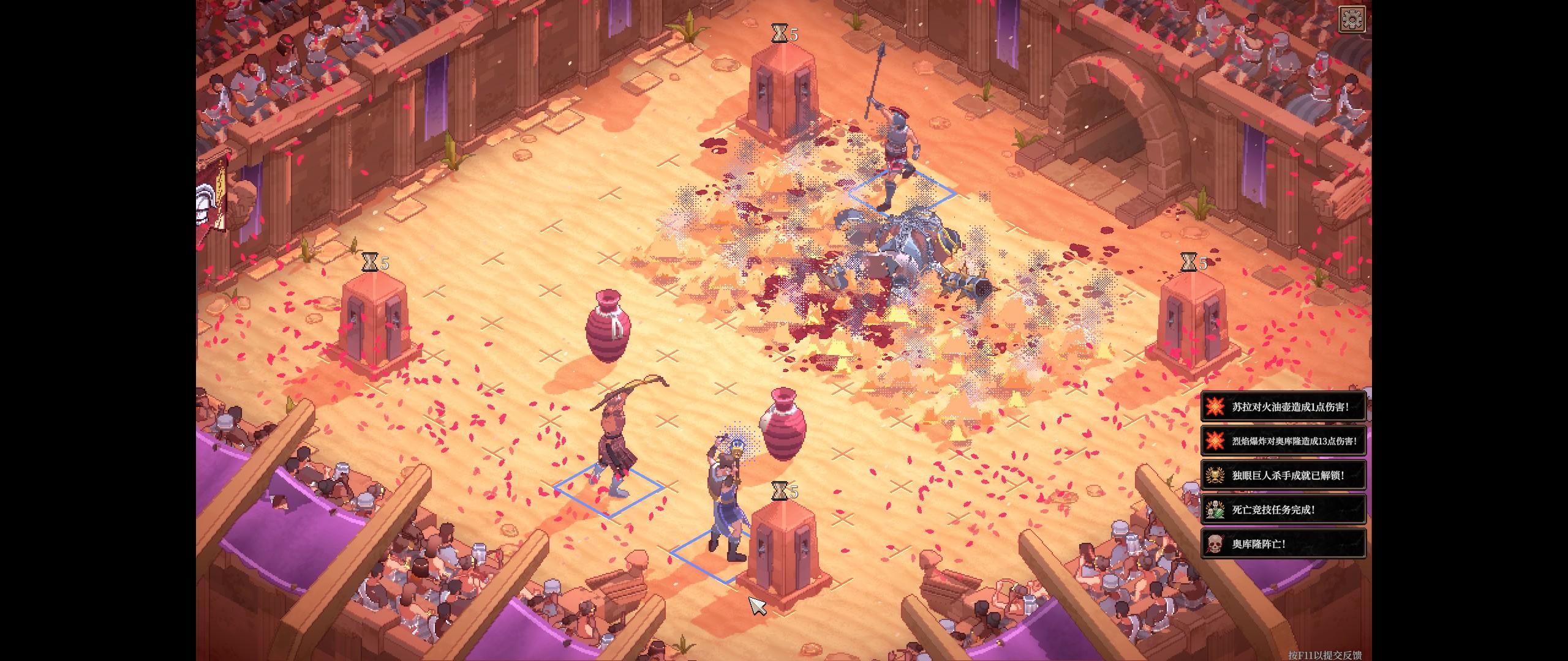 战斗方面,如果说黑暗地牢还需要探索地下城,然后进入横板回合制战斗,那本作就没那么多弯弯绕绕,设定好出场角斗士之后选了角斗场和难度就直接开打就完了。