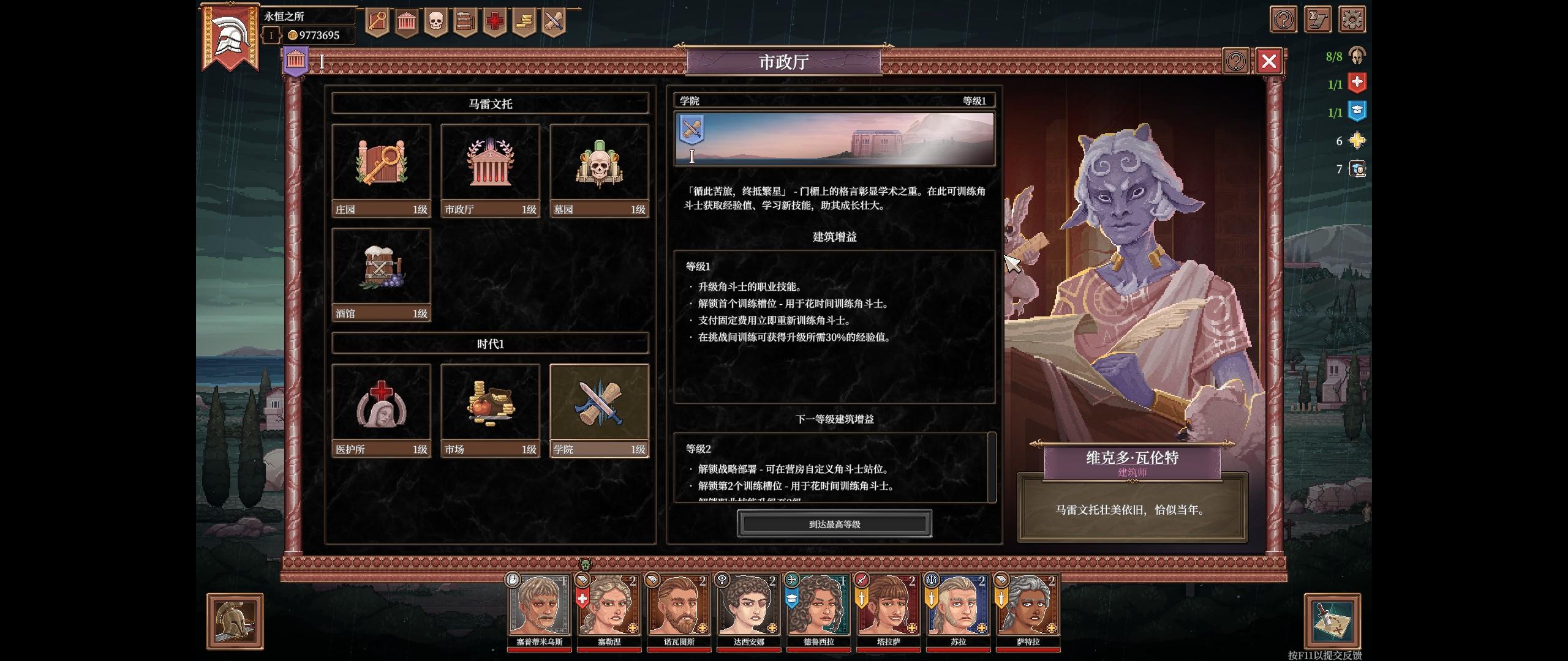 打完一个角斗场的最终boss难度之后就能解锁新的时代,花钱升级设施,让培养角斗士更加简单,毕竟本作说到底和暗黑地牢是一样的,角斗士其实也是消耗品,哪怕你花了很大功夫培养,但死掉了这个角色就是无了。