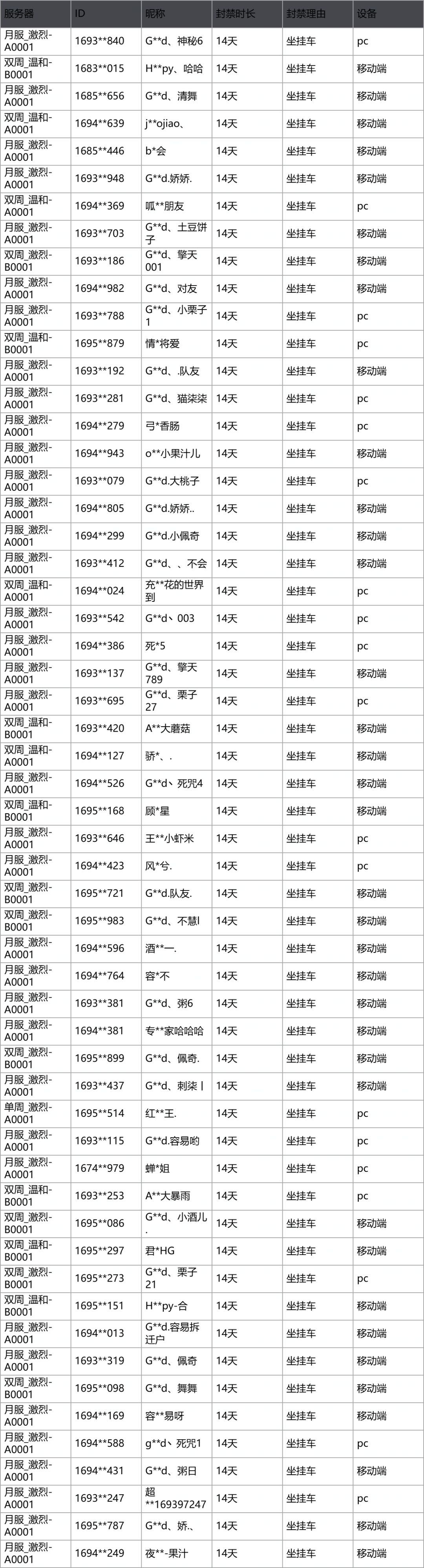 以下为近期因违规处罚情节较重的玩家公示名单,相关角色已进行复核,违规属实。如有任何疑问,请通过游戏内客服进行反馈。