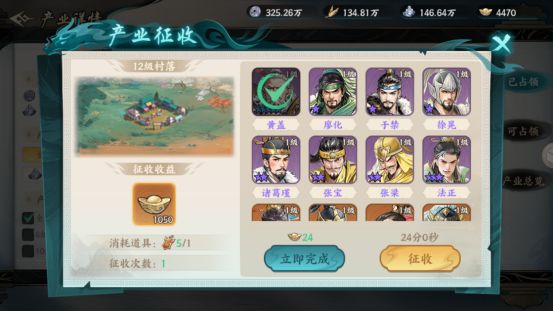 3)产业征收。对产业中的村落征收,根据村落等级可征收元宝不等,如:12级村落单次1000+元宝。