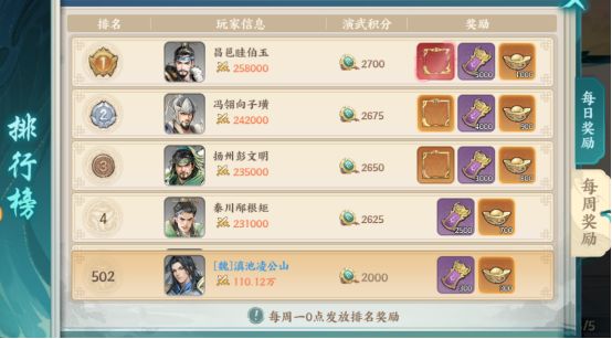 9)演武场排名。每日/每周都能获得一定元宝奖励。