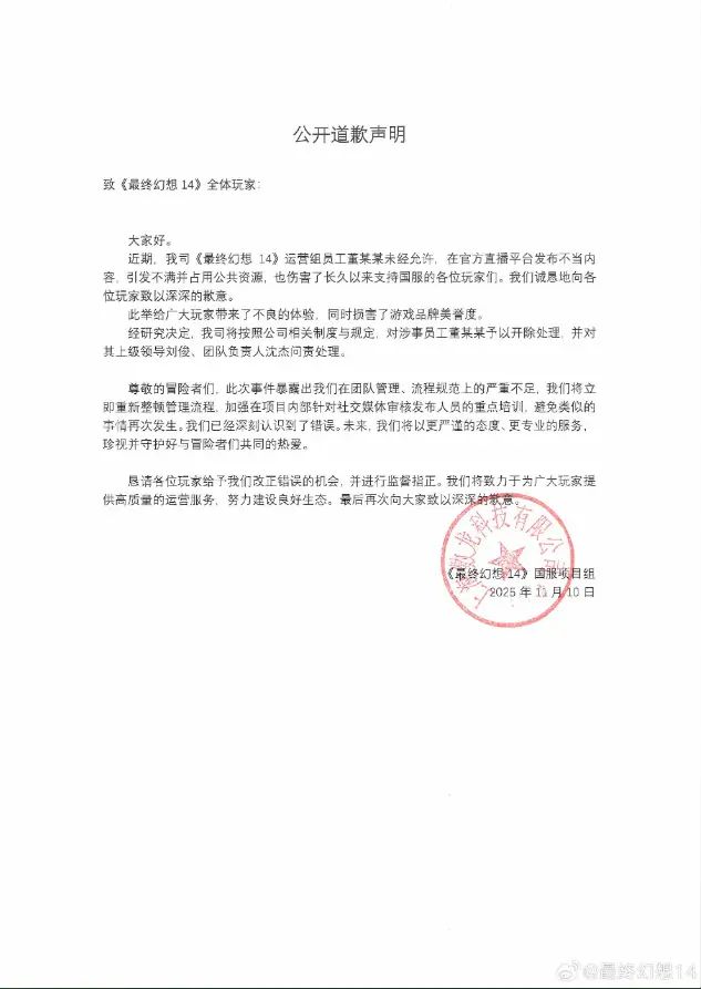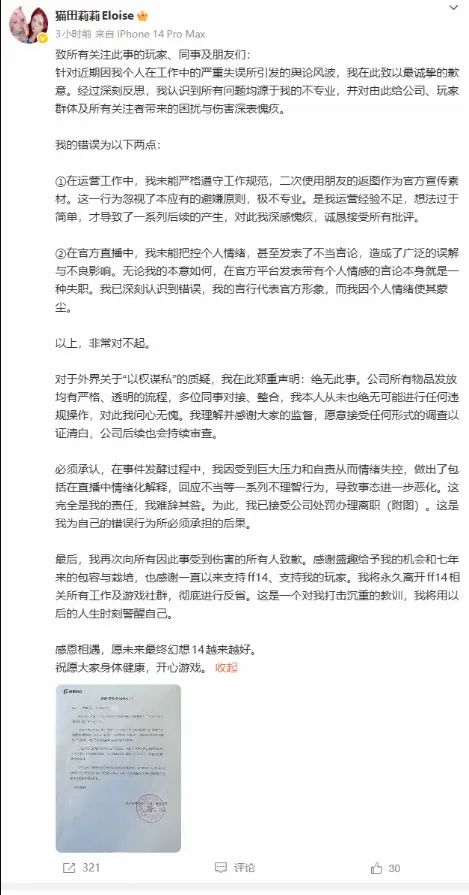 今日,游戏官方迅速发布公开道歉声明,宣布对涉事员工 “猫田莉莉” 予以开除处理,同时启动对其上级领导的问责程序,向玩家群体致歉。