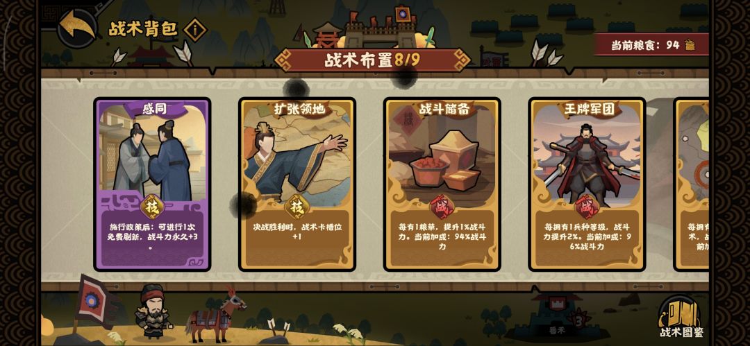 8.政策实行的话需要看自己的情况,战力不够补战力,后期庙算换战力粮食都可以,如果有余粮,“星罗棋布”和和各种兵种的伤害减免增益等最好要拿上
