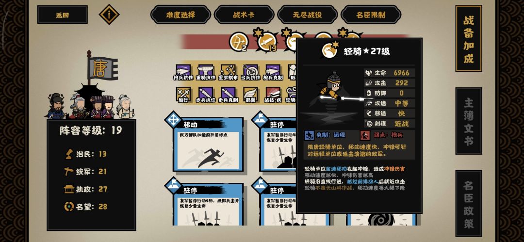 5.升级兵种不要乱升,建议只升两个(因为对方会有增伤减伤一类的),我个人比较喜欢升步兵和骑兵,主战是骑兵,因为可以快速解决战斗
