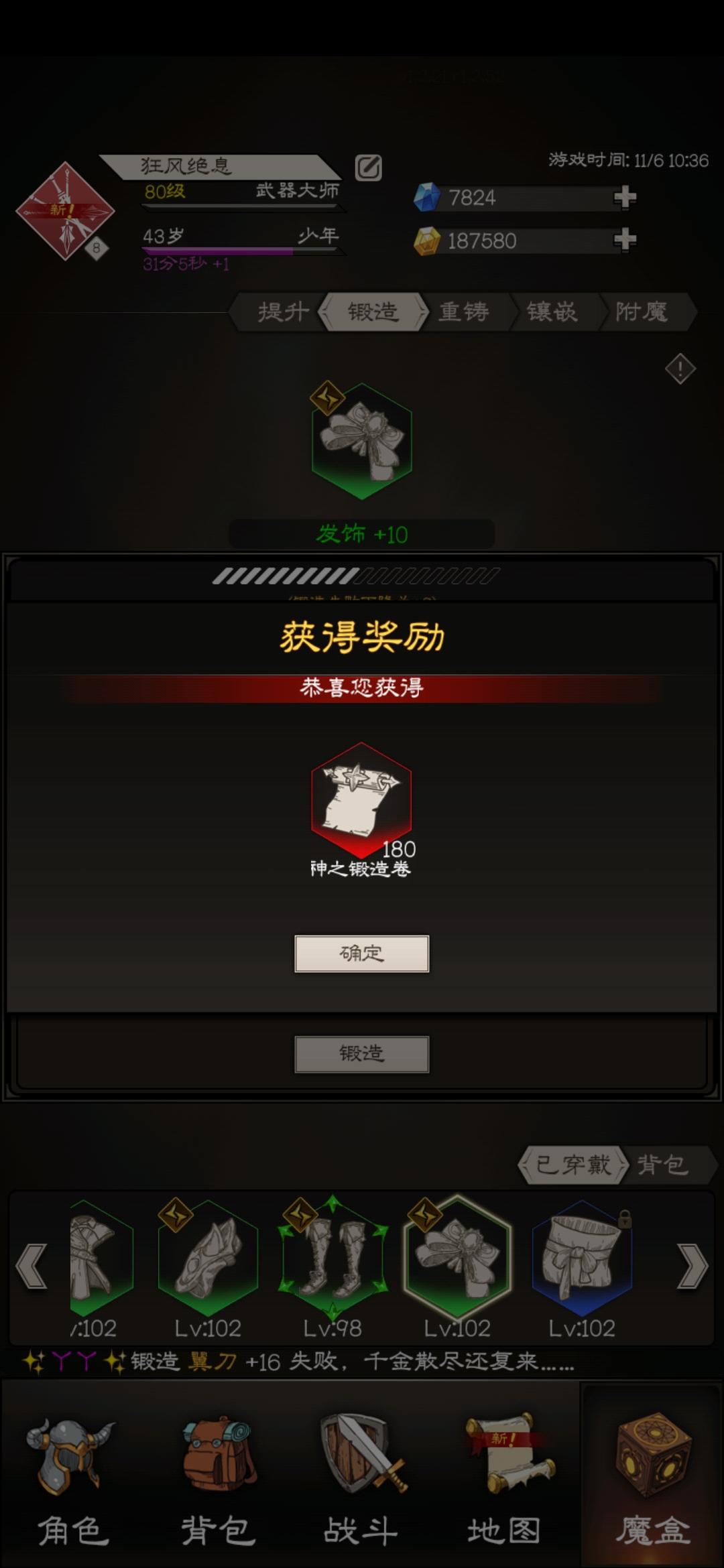 我在十二区玩,不上排行,不看大佬装备,因为我觉得,只要我足够坚持,我迟早能体验到大佬的快乐,于是我攒资源,憋发展,直到今天,我掏出了祖传下来的700万金币,500锻造券,打算整一个16然后祖传下去,之前新手时期整过一把武器,一直祖传到现在,我八十级神位25级也算个老玩家了,这些资源砸下去再给我一个16不过分吧?结果爱恨就在一瞬间