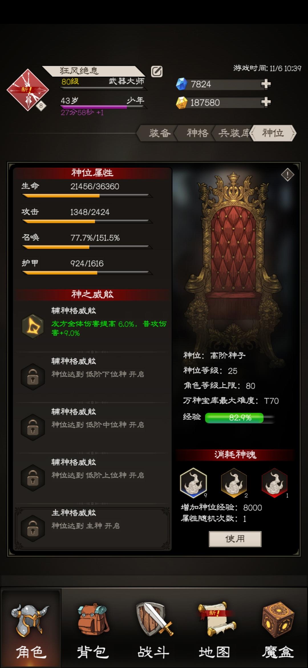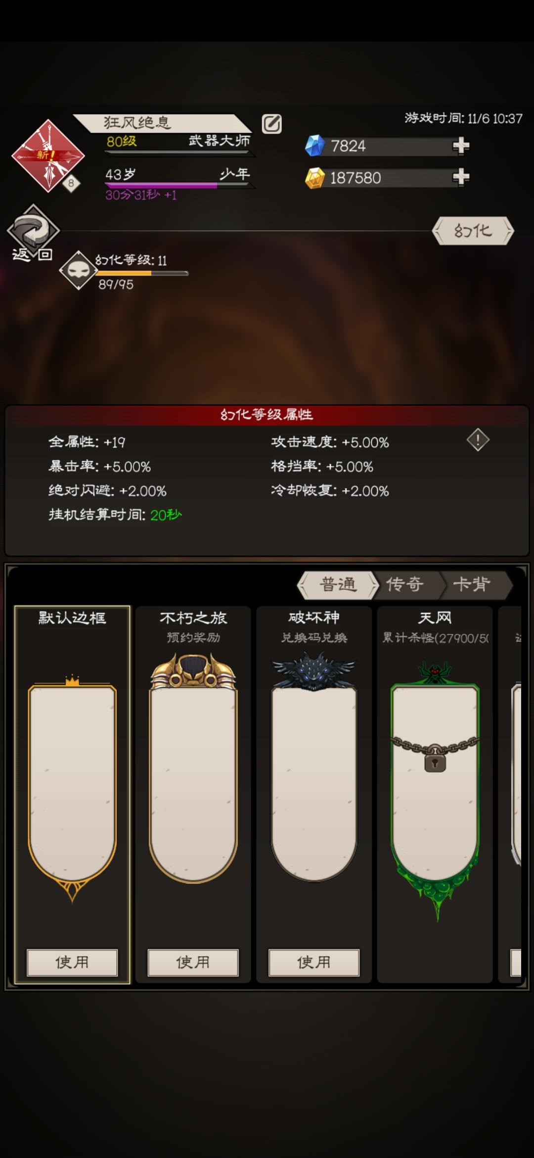 第一次接触到这么惊艳的放置类游戏,瞬间就爱上了,因为第一次玩,走了不少弯路,比如最高的兵装是sr骨龙牙(现在换大剑了),我就觉得很强了,马上安排三卡,幻化十级