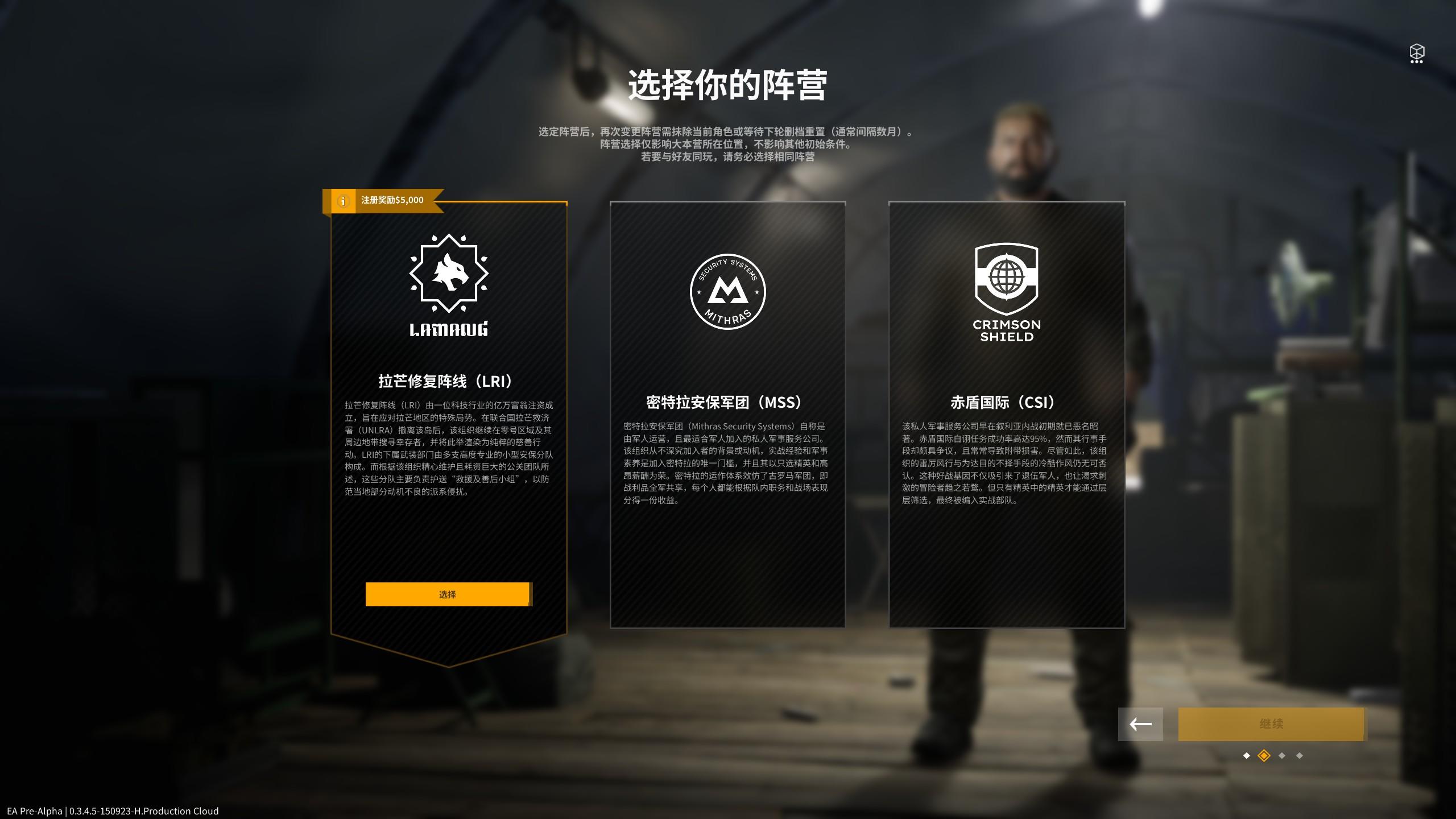 本作有这两种模式,推荐新手选择右边的pve模式,默认选择的是pvevp,也就是有敌对阵营的玩家,在地图中活动。而这就牵扯到一个阵营问题,游戏开局将会有三大阵营可供玩家选择,一旦选择就是暂时性的,现在变成一个月冷却cd后可以改选,而阵营也会体现在那一张超大的地图里,游戏的三个角落就是三大阵营,然后阵营中会有一些区域,比如说安全屋往上的就能被称作新手村,新手村之上就是与各个阵营交界的冲突区,中间的区域就被称作辐射区。