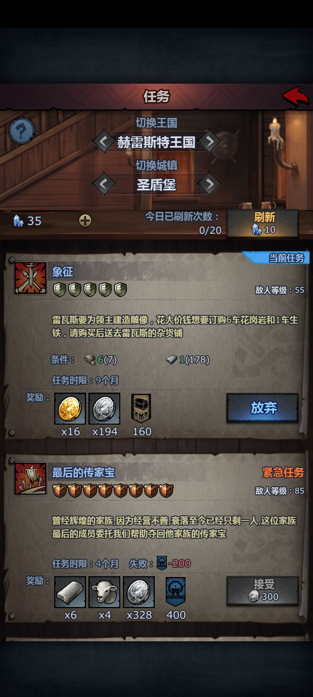 刷法拉时候建议,一月接跑商去塞宁,扫一圈杂货铺酒馆,二月接跑商去希尔过启航节,继续扫货,看看有没有固若金汤,五盾精钢任务别考虑,能打七盾才能打。